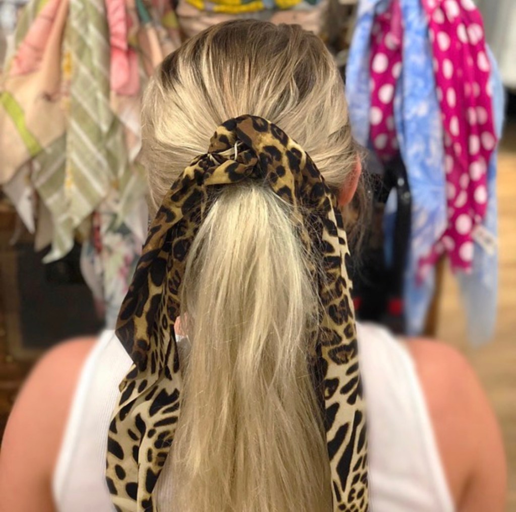 The fourth photo in the collage is a cheetah print scarf in my ponytail. Cheetah print and snake print have been popular for some time now, and they will continue to stay trendy as new animal prints are also introduced such as zebra and cow print. Hair accessories such as hair scarves and headbands are also going to continue to grow in popularity as we enter the Spring and Summer seasons.